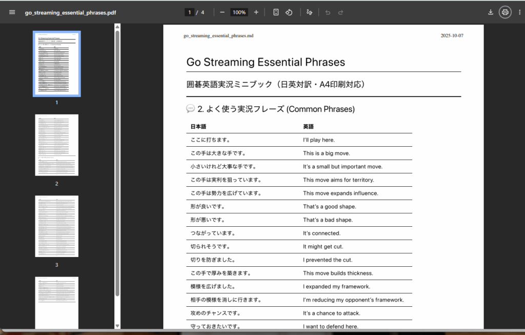 囲碁の英語配信をするためのフレーズその他を AI を使ってまとめていってます。 その一部、A4 印刷4枚分のフレーズ集を PDF にしてみました。よければお使いください。 例えばこんなのです。 この戦いが勝負を分けます。 This fight will decide the game... -