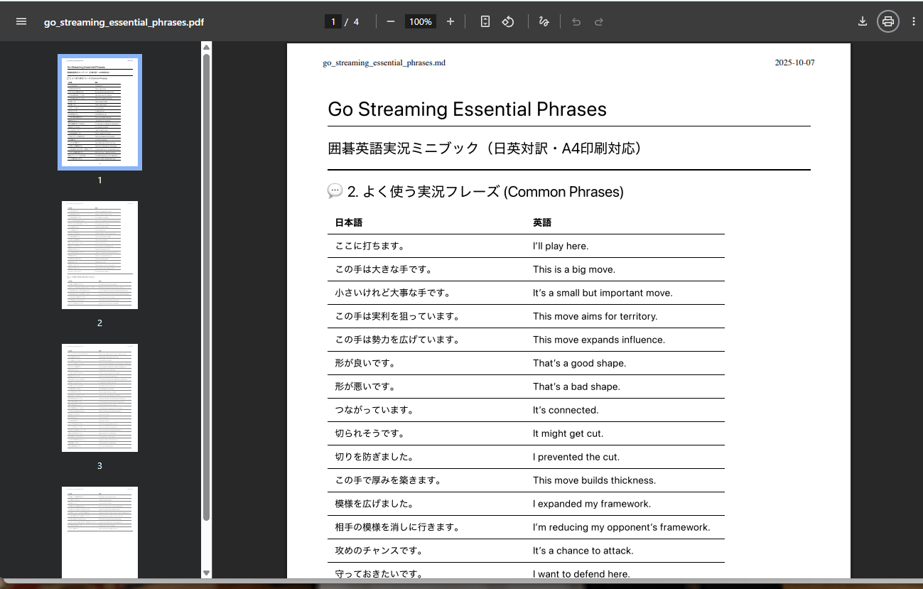 囲碁の英語配信をするためのフレーズその他を AI を使ってまとめていってます。