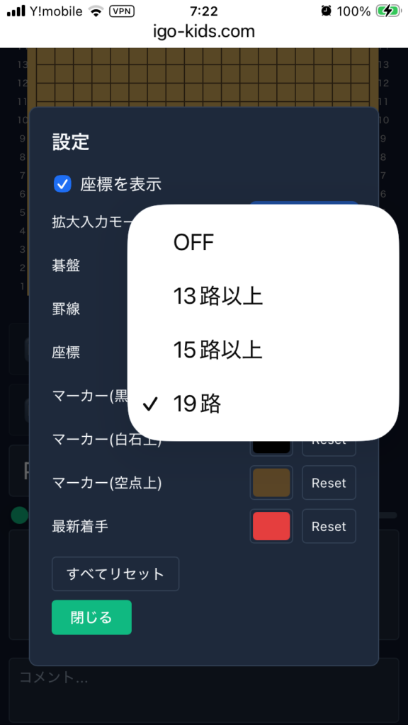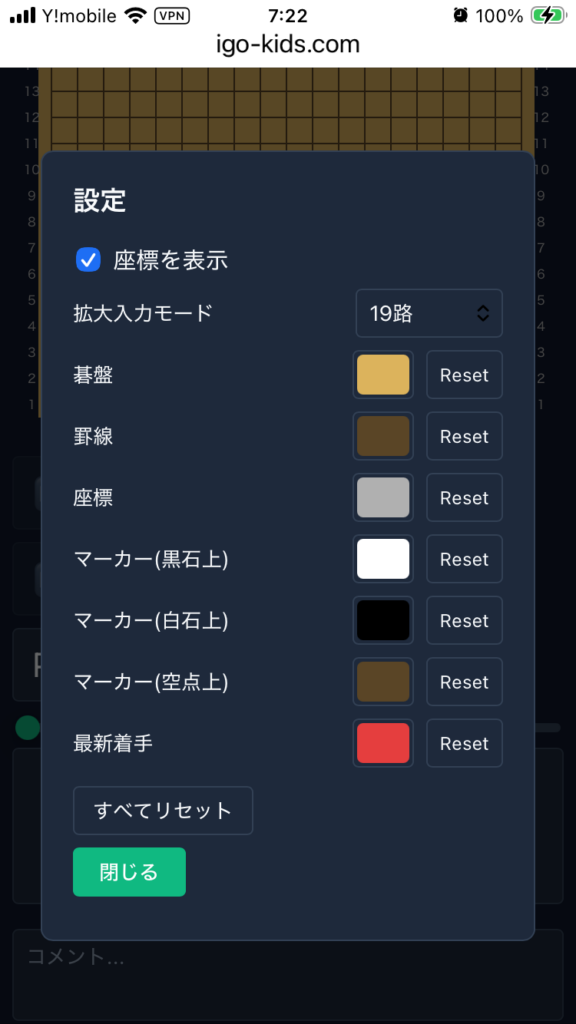 設定画面(スマホ用部分拡大表示・碁盤や線、文字の色設定)